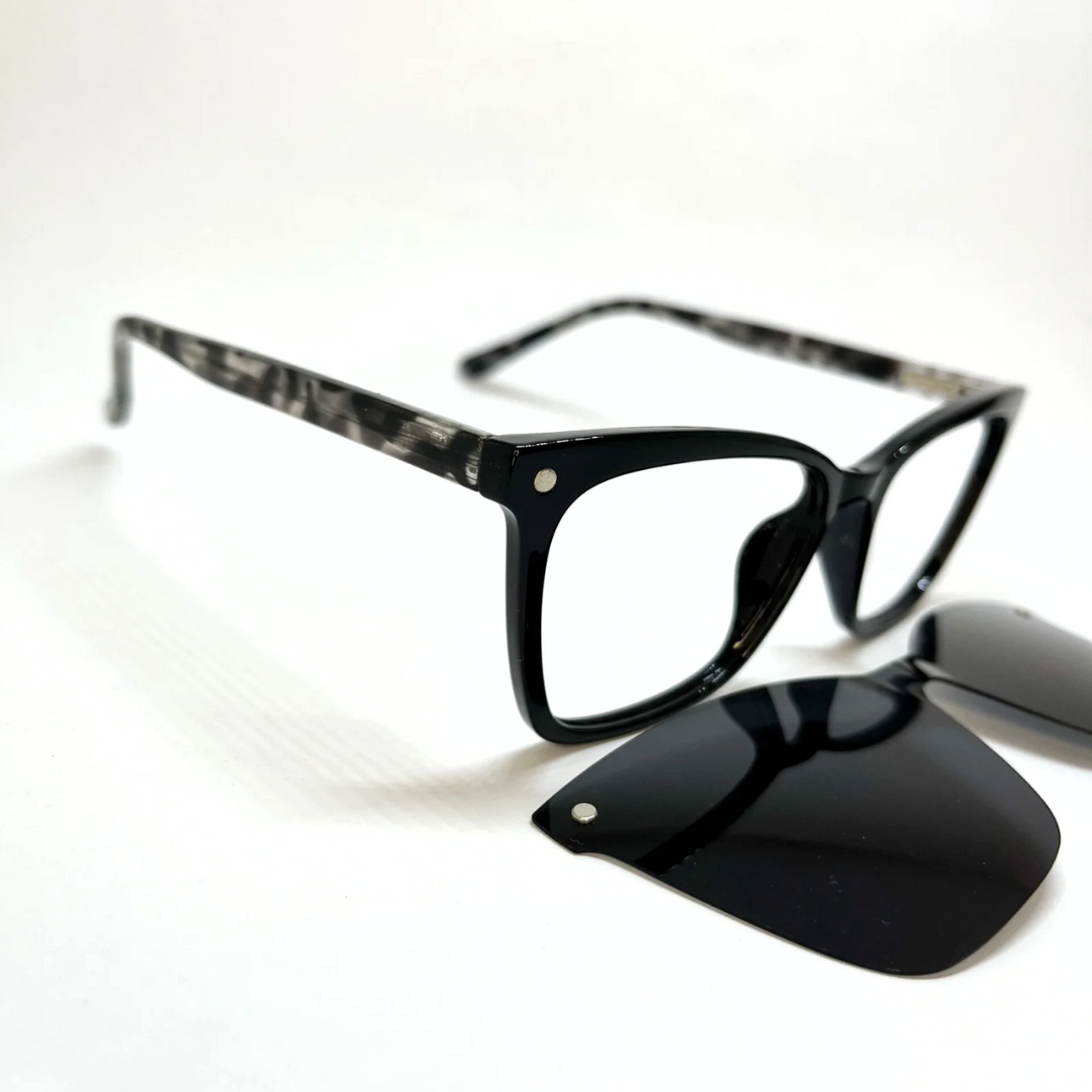 Feita em acetato preto e branco com hastes mescladas e monocromáticas, essa armação agênero é um verdadeiro coringa no seu armário. Ideal para todos os estilos, o modelo dois em um conta com um clip de encaixe que transforma seus óculos de grau em óculos de sol, oferecendo praticidade e um visual ainda mais estiloso.