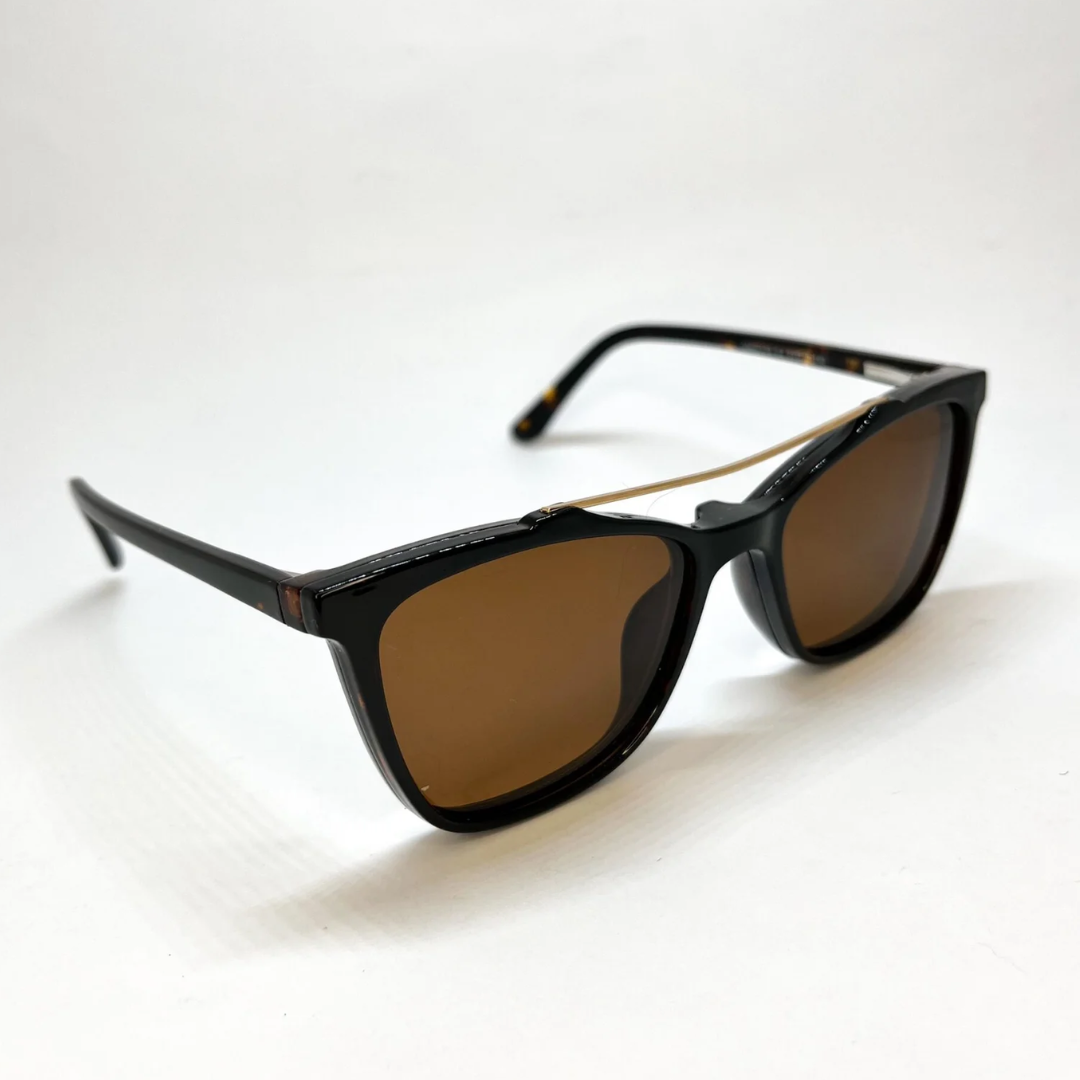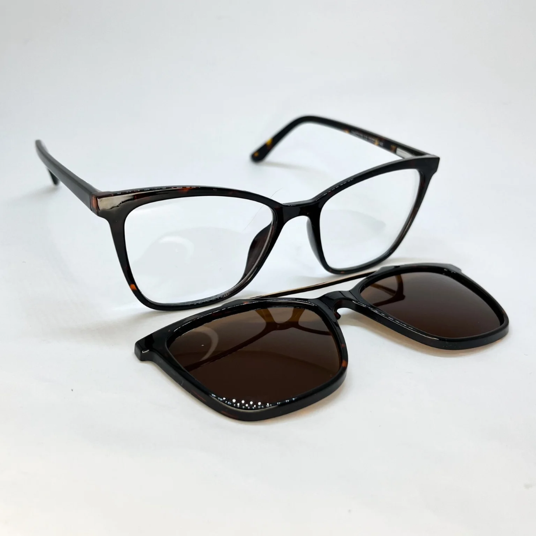 Modelo 2 em 1 com clip solar de encaixe. Transforme seus óculos de grau em um óculos de sol!